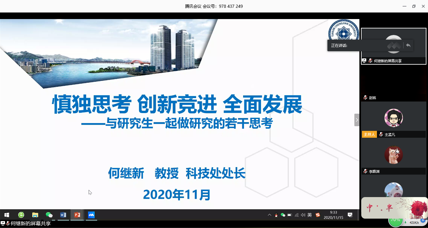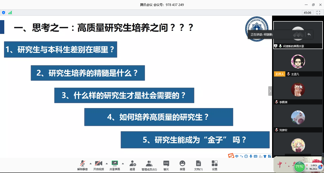 为了深入学习贯彻习近平总书记关于研究生教育的重要指示和李克强总理的批示,深入落实孙春兰副总理和陈宝生部长在会议上的讲话精神,11月15日上午,球王会聘请天津城建大学科技处处长何继新教授作了题为“慎独思考、创新竞进、全面发展”——全国研究生教育会议精神学习与公司产品专题讲座。公司党委书记、经理赵丽华、副经理齐莉丽、全体专任教师及全体研究生认真聆听了讲座。讲座以线上形式进行,由齐莉丽主持。